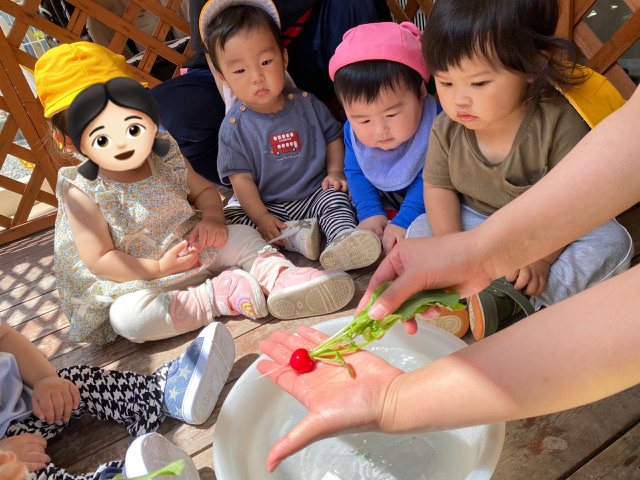 みんなで「あーっ😲」と目を丸くして、ツンツンとさわってみたり、「あかいね❕」と色を教えてくれたりと大興奮😆