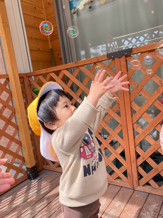 2歳児さんが上手に「ふう〜」と吹いてくれたり、先生が吹いてくれたシャボン玉を触ったり見たりして楽しみました🎈