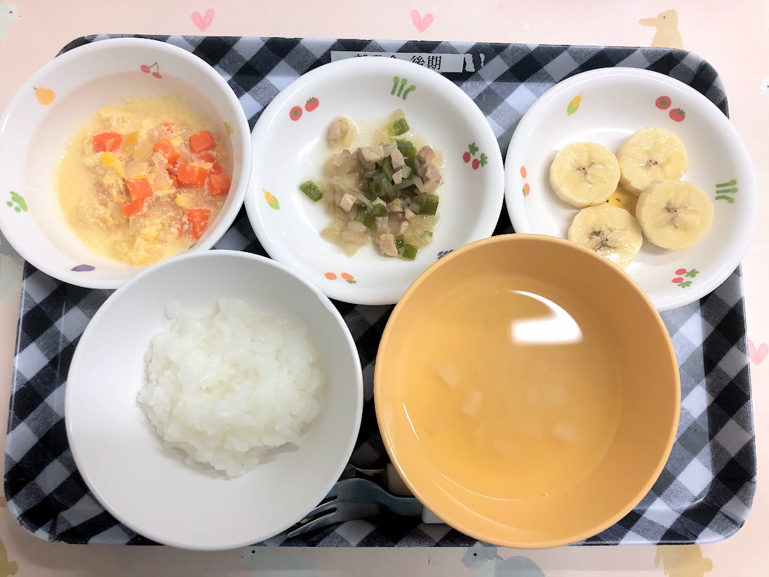 《離乳食:後期》【かゆ】【野菜の豆乳玉子とじ煮】【鶏肉ともやしのやわらか煮】【みそ汁】【バナナ】
