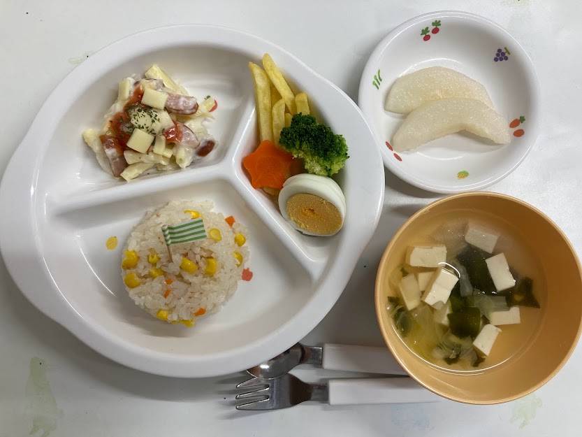 《幼児食》【ご飯】【ピザ風マカロニ】【フライドポテト】【スープ】【梨】