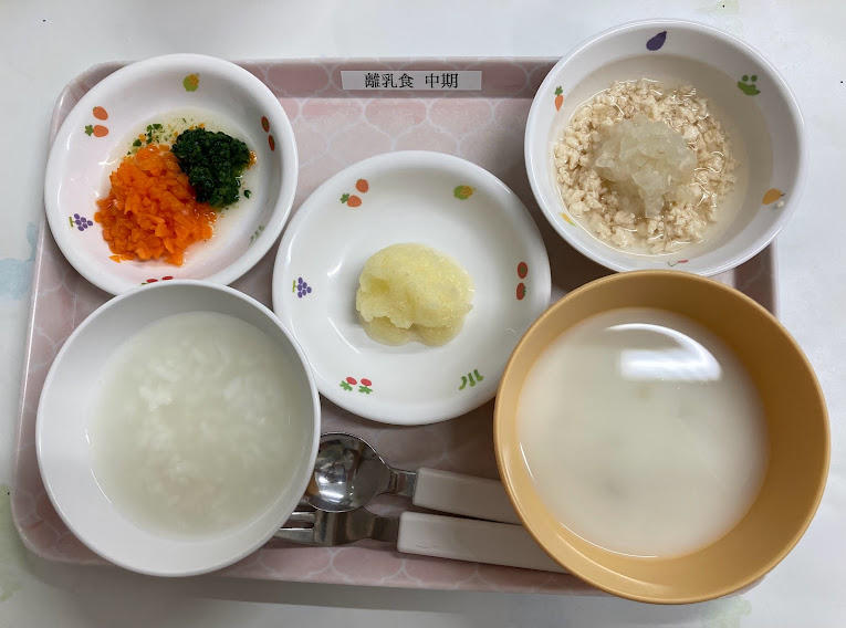 《離乳食中期》【かゆ】【鶏肉と玉ねぎのやわらか煮】【小松菜のサラダ】【ミルクスープ】【すりおろしりんご】