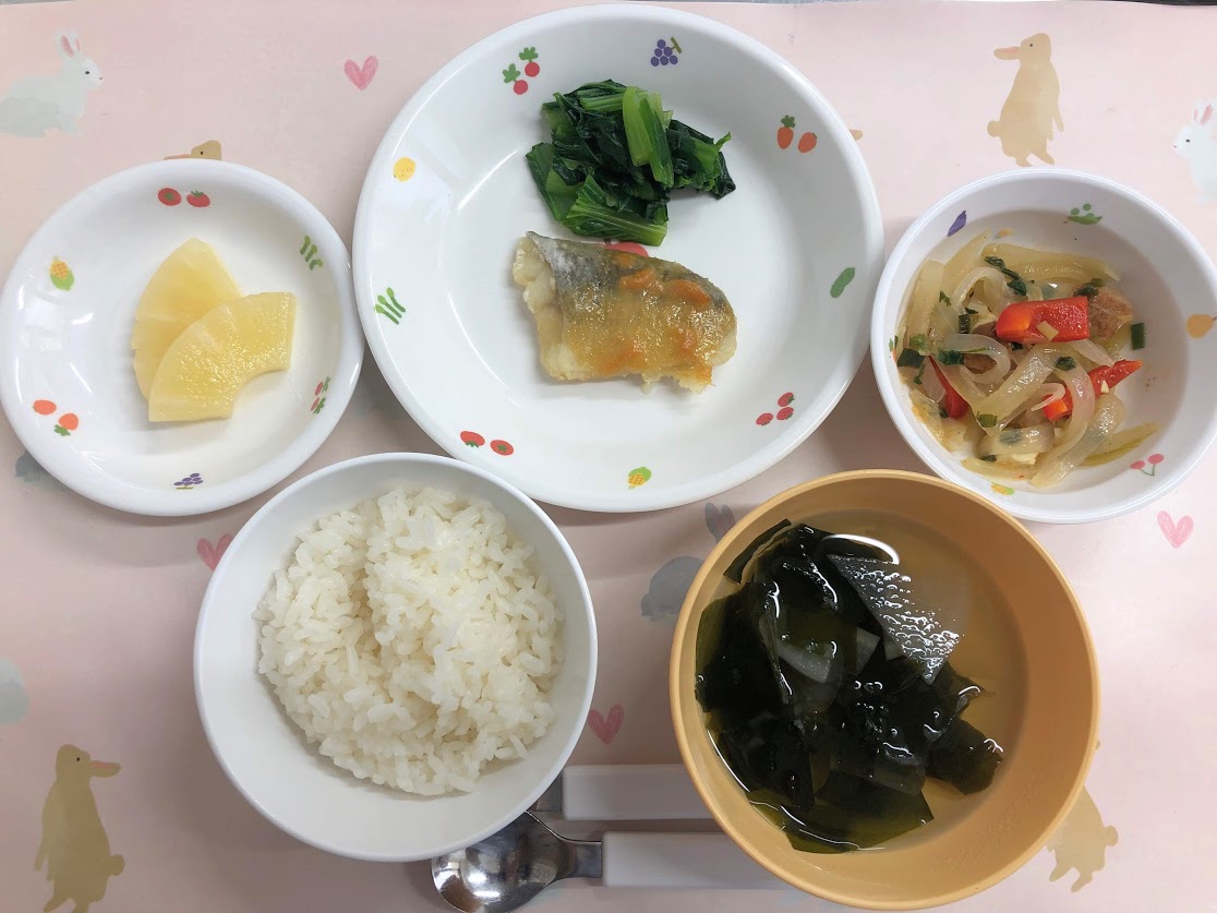 《幼児食》【ご飯】【助宗タラの変わり西京風焼き】【厚揚げのソテー】【すまし汁】【パイアップル缶】