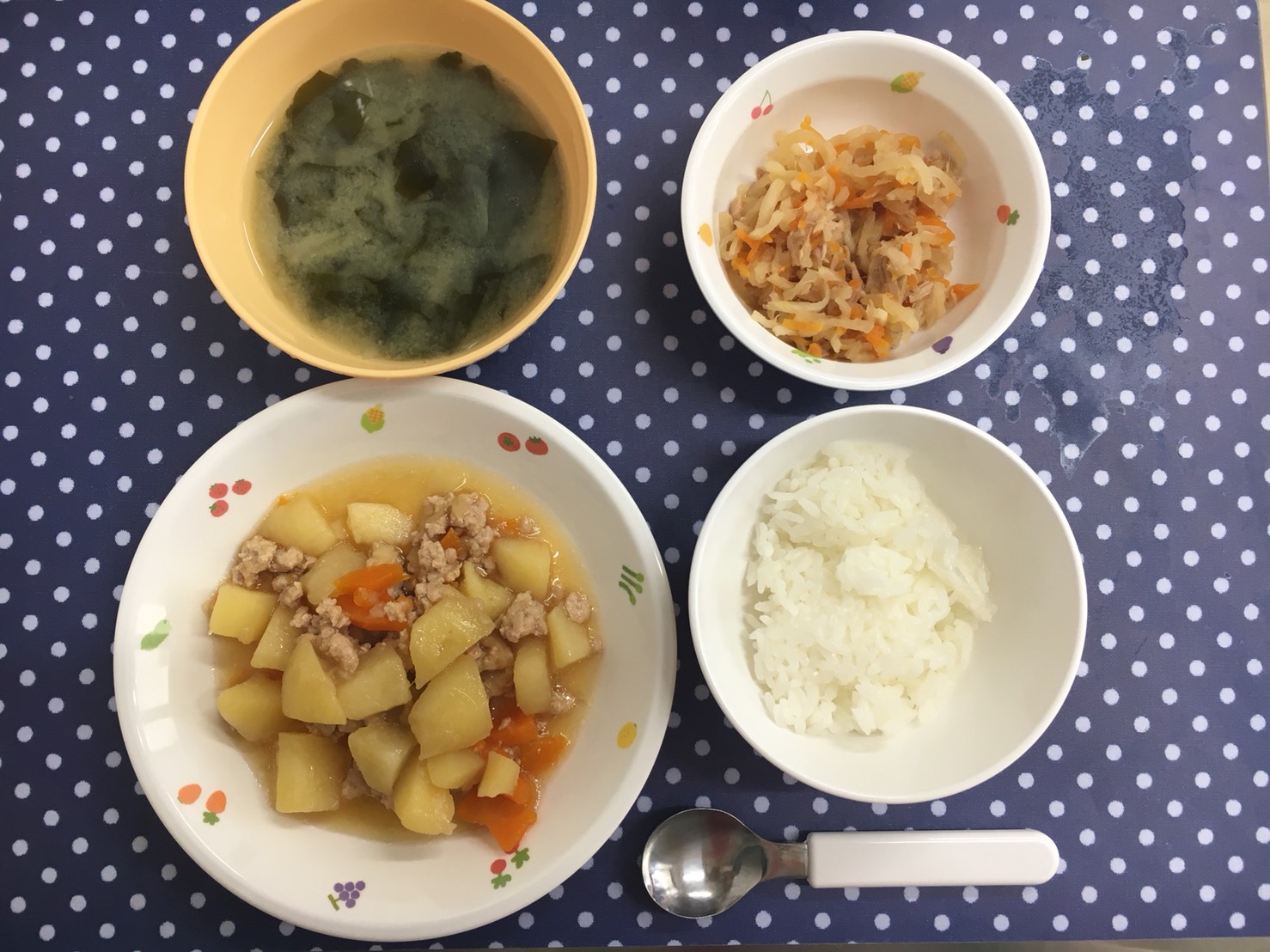 《幼児食》【ごはん】【そぼろ肉じゃが】【切干サラダ(にんじん・ツナ)】【みそ汁(ごぼう・わかめ)】