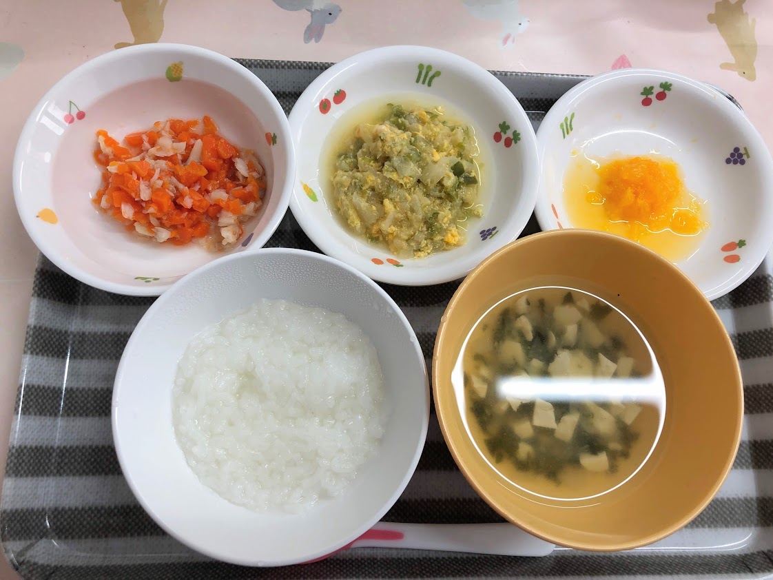 《離乳食:中期》【かゆ】【助宗タラと人参のやわらか煮】【白菜の玉子とじ煮】【みそ汁】【オレンジ】