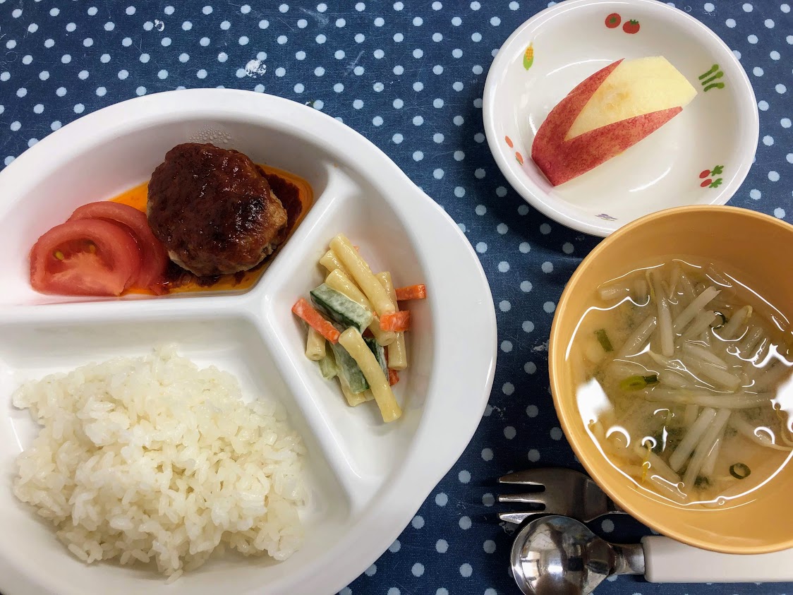 《幼児食》【ハンバーグ】【マカロニサラダ】【ご飯】【ねぎともやしのみそ汁】【りんご】