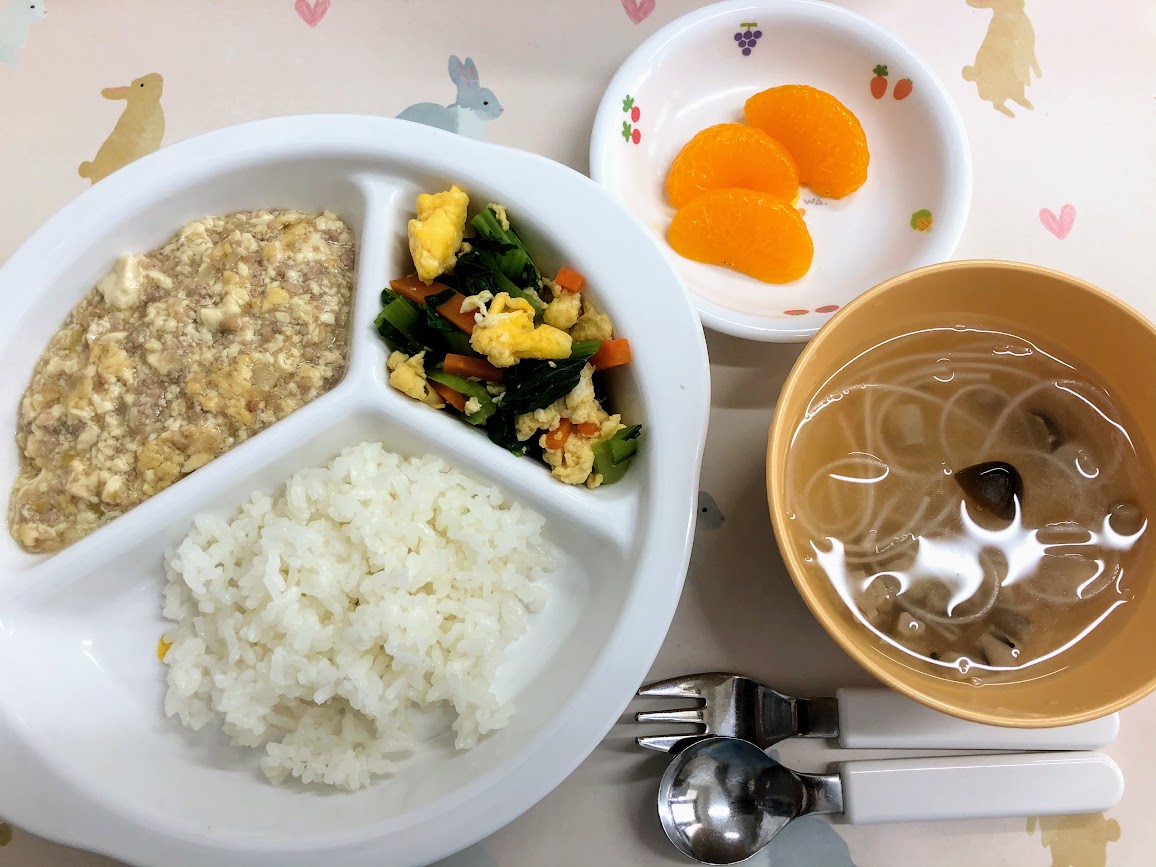 《幼児食》【ご飯】【麻婆豆腐】【小松菜のいり玉子和え】【はるさめスープ】【みかん缶】