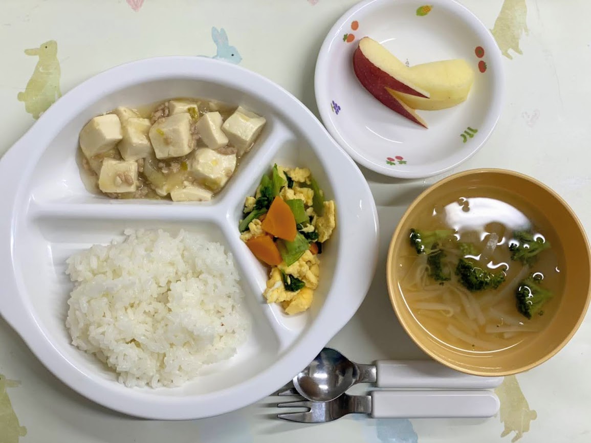 《幼児食》【麻婆豆腐】【チンゲン菜の炒り卵和え】【中華スープ】【バナナ】