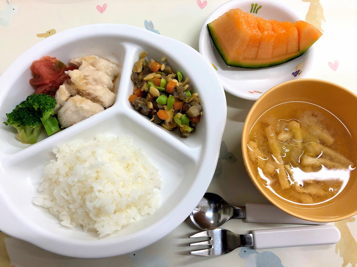 《幼児食》【ご飯】【鶏ささみのくずたたき】【五目炒り煮】【みそ汁】【メロン】