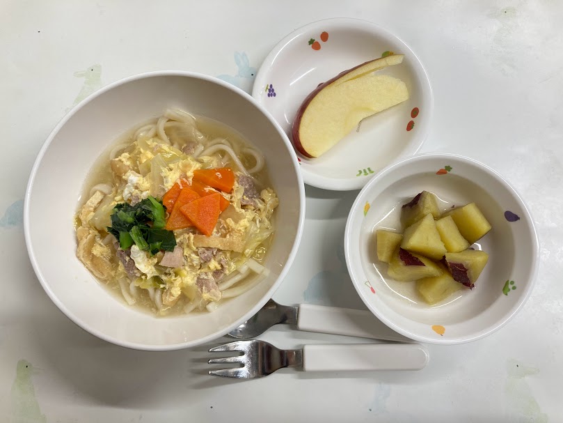 《幼児食》【あったか豚肉の玉子とじうどん】【さつま芋の塩バター煮】【りんご】《離乳食後期》【豚肉のくたくたかき玉うどん】【さつま芋のマッシュ】【バナナ】《幼児食おやつ》【チーズおにぎり】《離乳食後期おやつ》【野菜リゾット】