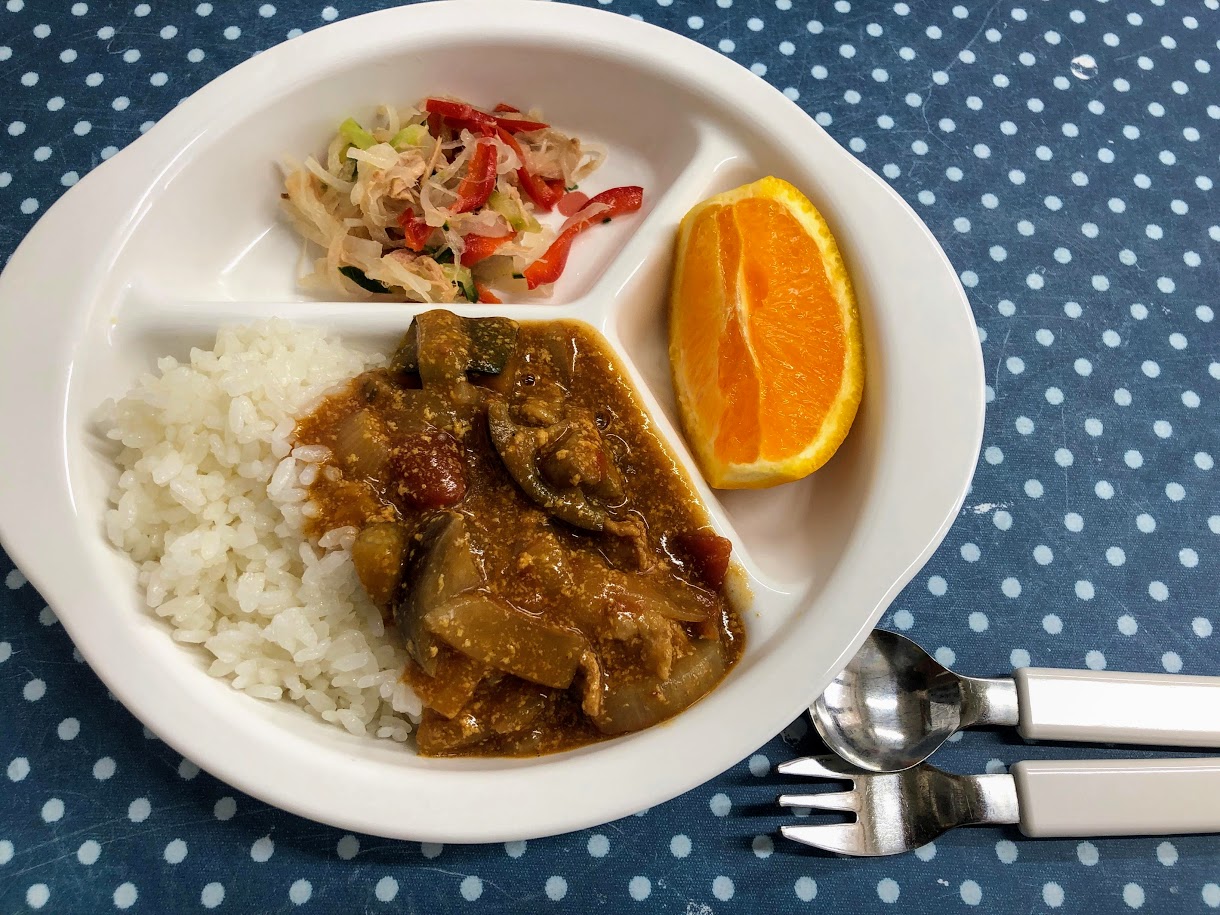 《幼児食》【夏野菜の豆カレー】【和風ツナサラダ】【オレンジ】《離乳食:後期》【かゆ】【鶏肉と大豆のトマトみるく煮】【大根サラダ】【オレンジ】《幼児食おやつ》【フレンチトースト(クッキング保育)】《離乳食:後期おやつ》【トーストスティック】