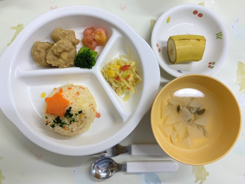 《幼児食》【人参ピラフ】【お豆腐のチキンナゲット】【キャベツの彩りサラダ】【スープ】【バナナ】《離乳食:後期》【人参かゆ】【鶏肉と豆腐のトマト煮】【キャベツのサラダ】【スープ】【バナナ】《幼児食・離乳食後期おやつ》【おとうふホットケーキ】※幼児のみ牛乳